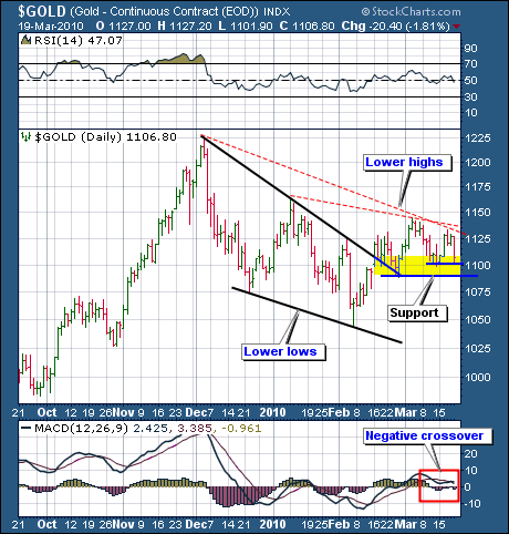 Gold was up $4.80 (0.44%) for the week, although it was down hard on Friday, falling -20.40 to close the week out at $1106.80. The chart below shows gold breaking out of a falling wedge pattern in mid-Feb.