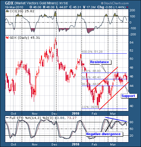 Gold stocks ended the week with a slight gain of +0.32 to close at 45.31 for a gain of +0.71%. Until the dollar broke out on Friday and the stock market finally retreated, the GDX had been up to an intra-week high of 46.84. It gave almost all of the gain back on Friday.