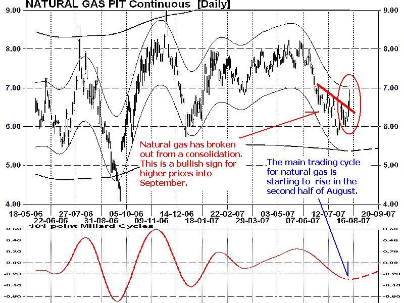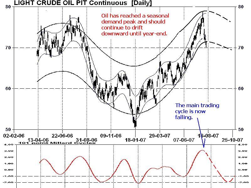 The normal annual demand forces for oil have reached a crest again. Mid-year driving pressures, which usually peaks in between early August to as late as mid-October, has forced this commodity once more to roar over $78 in early August in similar fashion to last year. Oil then follows a typical path of drifting downward to a low late in the 4th quarter. Natural gas, on the other hand, begins to escalate upwards during this time and tops in October to December depending on winter weather.