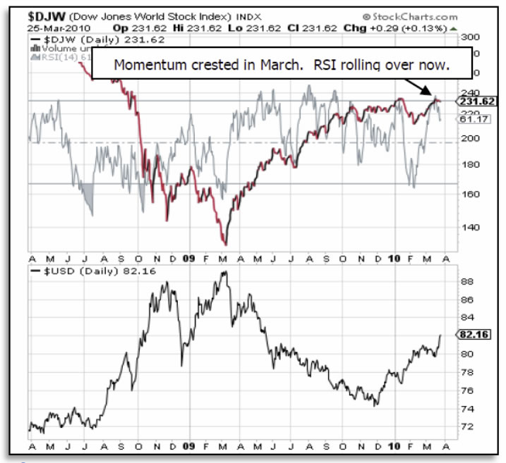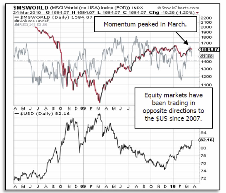 Bottom line: Models suggest a high probability of range-bound trading for global equities into mid-year. As the stock markets are trading on an average 16-week cycle. The next low is anticipated in June or early July. This implies that stable pressure can be expected in April and some selling pressure in May. With a backdrop of fair valuations, improving overall world GDP growth and steady buying pressure, the outlook remains positive for 2010.