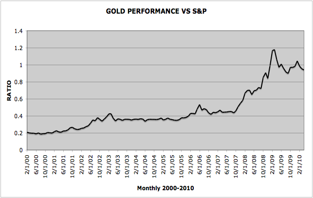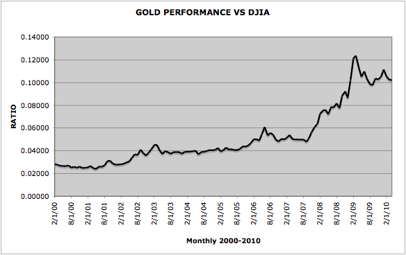 The graphs below depict what I mean. Gold's real value is determined not in the price of a fiat currency, but as a ratio to other assets, and this is where gold has really shined over the past decade.