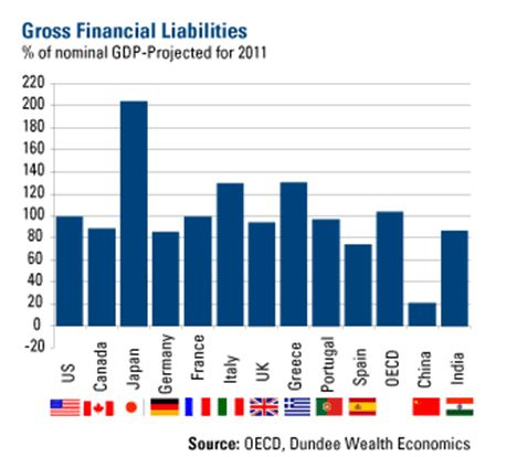 Sovereign debt is a key driver of the current economic jitters. The chart below shows next year’s sovereign debt estimates for the G-7 and other key global economies – the U.S. debt in 2011 would be about equal to GDP ($15 trillion), while the debt loads carried by Japan, Italy and Greece would exceed GDP.