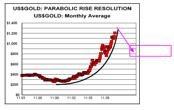 Parabolic structures have three components. First, is the unnatural rise, driven by emotions rather than the head. As Gold investing has become mainstream, it has become more subject to emotions. Greek crisis and expectations of an imminent collapse of the EU are indicative of such an emotional state. Investors are buying Gold, not because of the merits of owning Gold, but because they "know" the price of Gold is going up. Australian investors are not buying Gold because of imminent collapse of the EU, but because the price of Gold is going up.