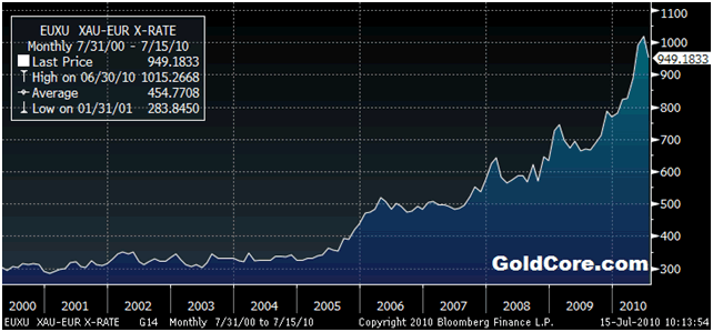 Gold in euros was trading at less than €300/oz at the dawn of the millennium and given the significant risks mentioned above, not to mention worsening fiscal situations in the UK, the US and most western nations, it seems quite possible that gold could rise to €7,500/oz in the coming years.