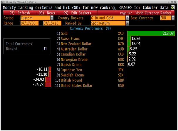 Euro Performance Versus G10 Currencies and Gold - 10 Years