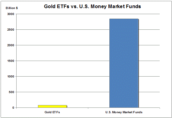 According to hedge fund Paulson & Co, if you added up all the money invested in gold ETFs, it would total $78.3 billion (at $1,200 gold). The amount of money currently sitting in U.S. money market funds, on the other hand, comes to $2.849 trillion.
