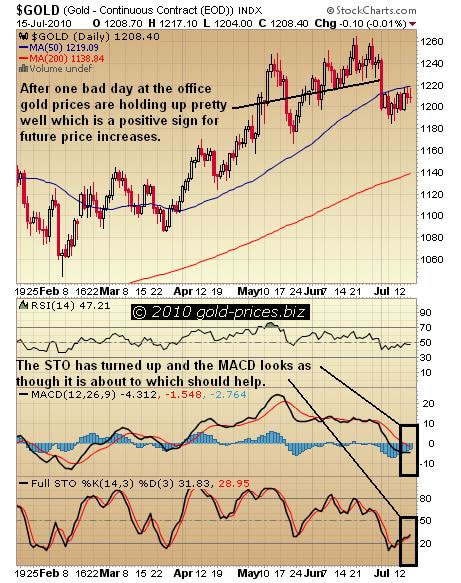 Taking a quick look at the above chart we can see that apart from one bad day at the office, when gold was sold down about $40.00/oz, gold prices are holding up pretty well especially for this time of the year when the summer doldrums usually kick in and volumes drop off significantly. We can also see that the STO is heading north and the MACD looks as though it is also ending its downward slide, which all bodes well for gold prices. If gold can maintain these levels through until September then the stage will be set for a major advance and the forming of a few new all time highs.