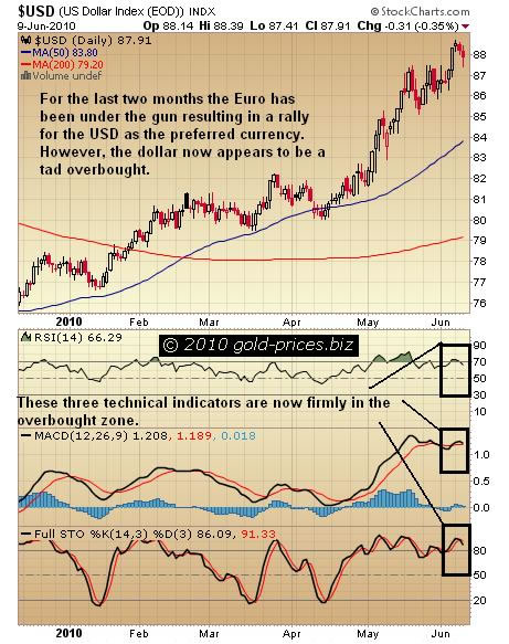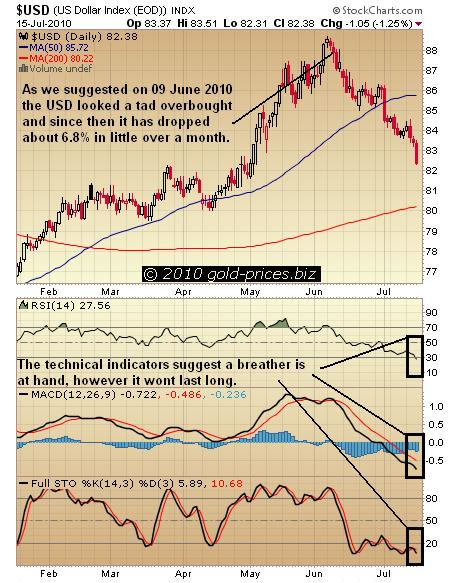 Turning to the chart for the USD we can see that it has resumed its trek south, all as we suggested on 09 June 2010 when the USD looked a tad overbought and has since lost about 6.8% in little over a month. The technical indicators have been floored so some consolidation may be on the cards, however we expect it be short lived as the economic recovery in the United States continues to fade and the general mistrust of paper currencies compels investors to re-think their strategies.