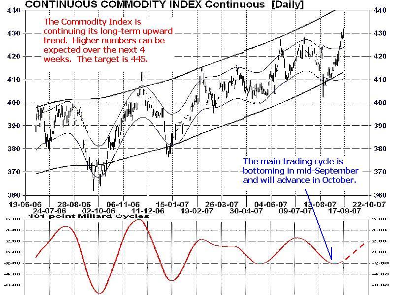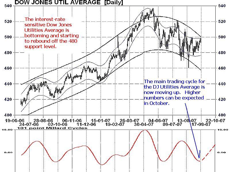 Utilities, the most interest rate sensitive equities group, have also received a thrust upwards due to the rate drop. The Dow Jones Utilities Average (Chart 4) traded over the 500 resistance level after declining from the July 2007 peak. This rise is expected to continue into October (see lower portion of Chart 4). The DJ Utilities Average also plays and important role as a leading indicator on the Dow Jones Industrial Average. Strength in the utilities sector often filters through to the DOW.