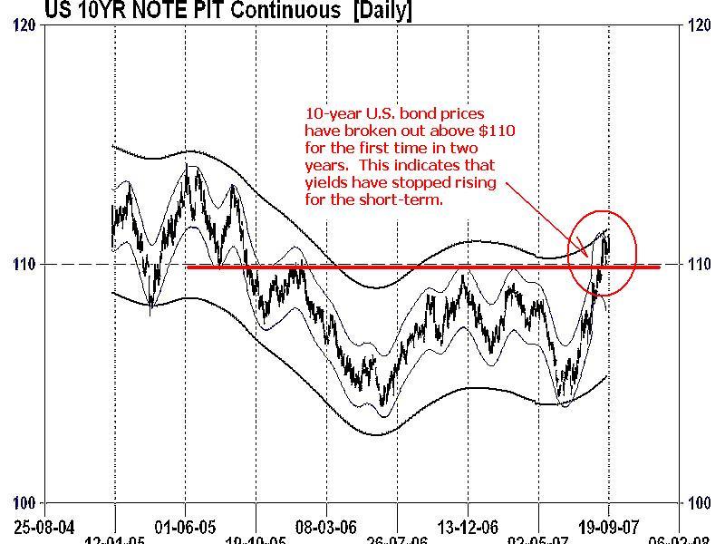Though longer-term, the fall of the USD increases inflation and will drive bond yields higher; in the short-term the opposite has occurred. The easing of the Fed rate has boosted 10-year US Treasury notes (Chart 3) above $110 for the first time in two years and is expected to continue advancing to resistance of $114 by December. However as commodities lead 10-year bond yields in the long-term, the fund rate cut of 50 basis points will help escalate the advance of most commodities and ultimately pull yields up and drag bond prices lower.
