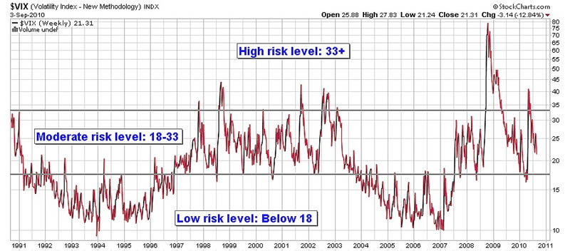 Updated models indicate a marginal improvement with 56% of the stocks in the broad-based New York Stock Exchange Composite (NYSE) trading over their 200-day moving average and 54% on Canada's TSX (Charts 1 and 2). The Volatility Index (VIX) has a reading of 21.31 which is still in the moderate risk category of 18 to 33 (Chart 3).