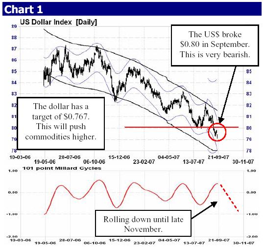 The U.S. dollar plays a very important role in the movement of commodities. A rising currency removes inflationary pressures, and a falling dollar fuels the fire. In September, after months of downward pounding, the U.S. dollar finally broke through the very important $0.80 support line. This is the last main support level for the greenback. Although the dollar has bounced off of this line seven times over the past 25 years, it has not remained below it.