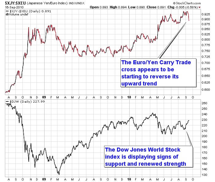 The Euro/Yen "Carry Trade" cross, which trends in the opposite direction to global stock markets, appears to be starting to rollover. This currency cross has been advancing for over nine months, and at the same time, the broad-based Dow Jones World Stock Index (DJWSI) has maintained a declining trend. The potential reversal of this "Carry Trade" cross would imply an increasing probability of favourable equity markets in Q4.