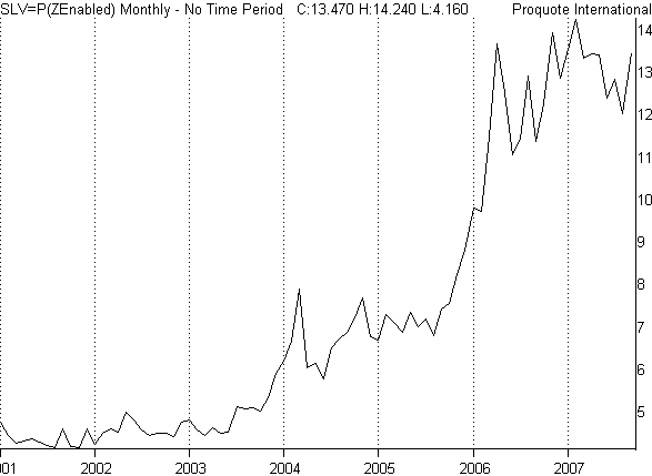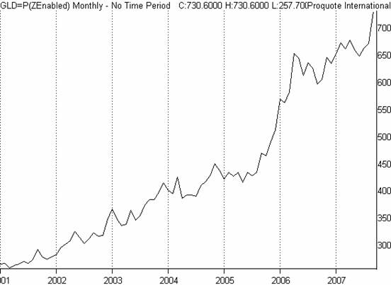 And another important consideration, particularly in light of the seven-year precious metals bull market we are currently experiencing – the gold price has increased on average more than 15% annually over the past seven years -- is the fact that while one may pay income taxes on withdrawals from the account once retired, the market gains made on precious metals investments held in a retirement plan are exempt from capital gains taxes. The value of this provision is further highlighted when one considers the fact that in America, gains of precious metals, including ETF's, held outside of an IRA are taxed at the 28% “collectable” rate, as compared to the normal capital gains rate of 15%. This feature can result in enormous savings and add considerable value to one's retirement investments over the life of the plan, especially under current market conditions. Note the strong price performance of gold, silver and platinum since 2001 in the charts that appear below.