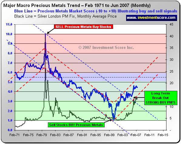 Relative Value: When the blue line is near the top of the chart in the red area with a score near the +10 level, it would take a smaller quantity of precious metals to buy a larger quantity of stocks and therefore it would be wise to sell some metal to buy some stocks. When the blue line is in the lower green portion of the chart with a score near +1 it would be wise to sell some stocks and buy some precious metals. As you can see from the grey line, the price of silver was very expensive in 1980 and relatively speaking very inexpensive in around 2000.