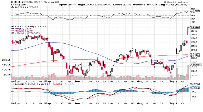 Technology is powering ahead particularly Oracle. This equity basically has been range bound for years. This was due to the fact that Larry Ellison was on a constant buying spree and was diminishing share price by constant share issuance in order to bank-roll his acquisitions. The recent momentum may indicate that this phase is over and the data base behemoth maybe ready to enjoy solid undiluted earnings growth.