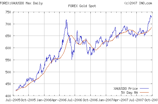 Gold made a new 28 year high close on the COMEX in New York yesterday. It was up $4.70 to $732.50 at the close. In overnight trading in Asia and Europe gold has continued to rally and has risen to $738.00/738.50 per ounce as of 1130 GMT. There seems to be strong support now at $726.
