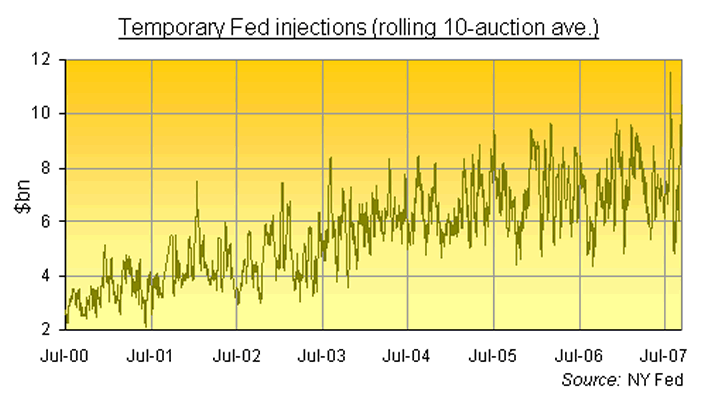 Barring the huge liquidity forced into the system by the Greenspan Fed in the aftermath of 9/11 (discounted from the chart above), the Fed has never made so much short-term money available as it has in Sept. 2007...nearly $203 billion.