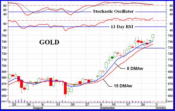 The short term moving average and momentum indicators (15 DMAw and 13 Day RSI) have kept us on the right side of this move for the past 5 to 6 weeks. It can't last much longer but as long as it does, keep with it. Momentum continues to track laterally inside its overbought zone indicating a continuous strong upside move (price wise). As mentioned in the intermediate term analysis, volume is a concern and remains so. We have a short term support at the $730 level and for this week as long as the price stays above that level we can assume the short term is still positive.