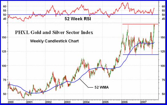 The chart shows the average performance of the universe of 160 precious metal stocks over the past several years, since the start of the Index bull market in 1998. From its 1998 bottom to this Friday's close this Index of 160 stocks has gained over 6000%. Not bad when you consider the number of component stocks. The PHLX Gold and Silver Sector Index, on the other hand, has only gained 303% from its low point at the start of its bull market in 2000.
