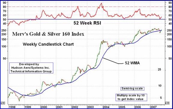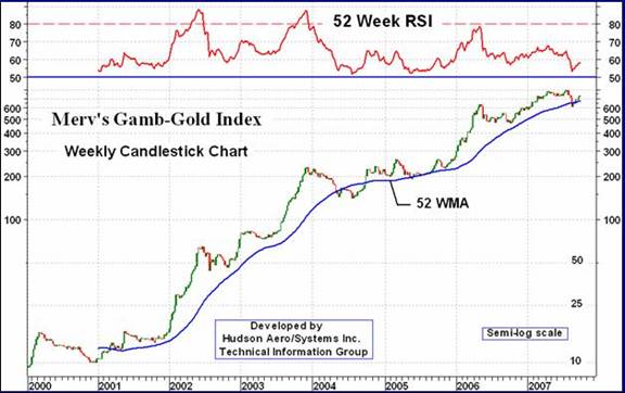 The Gamb-Gold Index was developed in early 2000 and may not have caught the lows it might have had earlier. However, since its early 2000 low to Friday's close its performance has been the best of the Merv's Precious Metals with a gain of 7831%. Despite some weakness over the past few weeks it is still the strongest Index from a long term standpoint. Momentum is weak but not as weak as the other Indices. The moving average still has a reasonable upward tilt to it. Having said all that it too can deteriorate quite rapidly should the overall market turn back to the down side. The negative divergence in the momentum indicator between its 2006 Index high and the Index higher 2007 highs is a serious concern. For now I'm watching if the Index can make new highs again.