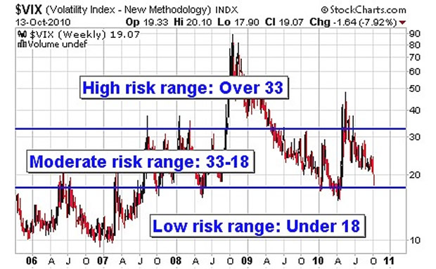 The CBOE Volatility Index is a very reliable gauge of risk on the S&P 500. Traders continually adjust their option positions according to market and economic conditions. This is reflected in the movement of the VIX. The best method of interpreting this index is through historic band ranges. Particular market conditions have a corresponding VIX reading. For example, during prolonged calm advancing markets (ie 2003 to 2007), the VIX registers about 18 or lower. As the equity markets decline or economic worries grip investors, the VIX displays levels in the 18 to 33 range (ie early 2008, part of 2009 and 2010). During brief periods of extreme concern (late 2008 and early 2009), the Volatility Index leaps to over 33.