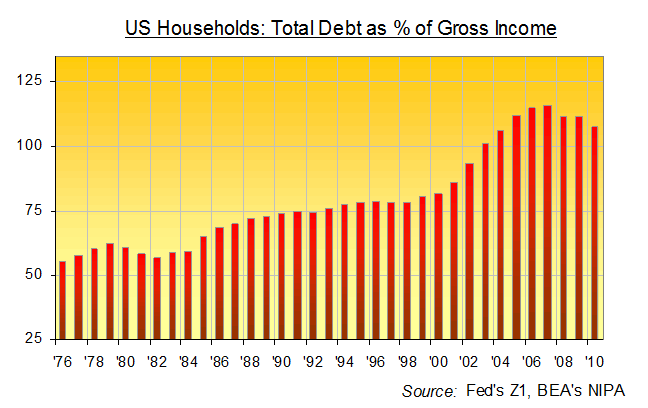 This, in short, is not the early '80s recession replayed (y'know, the one when gold, oil, stocks and bonds all sank together), much less the 1990-92 recession or 2001 slowdown. (Consumer leverage leapt as the Tech Stock Bubble collapsed; what kind of "recession" was that?) The slump of the last three years (and counting) benefits from neither inflation or wage growth. Debts must either be paid down from static incomes, or be written off by forgiving lenders. Devaluation isn't coming to help. Not yet at least.