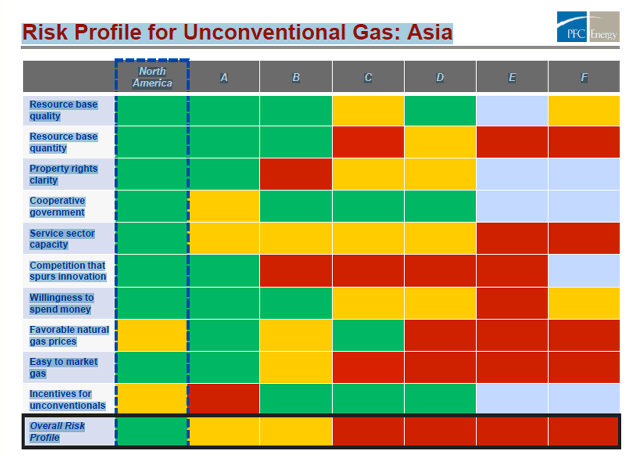 The piece shows the "red zones" in global unconventional gas (shale, tight gas, coal bed methane). Comparing the unconventional sector in North America to six unnamed Asian nations (lettered A to F, so as not to hurt any feelings), across ten categories related to the gas business in each country. Green is good, yellow okay, red poor.