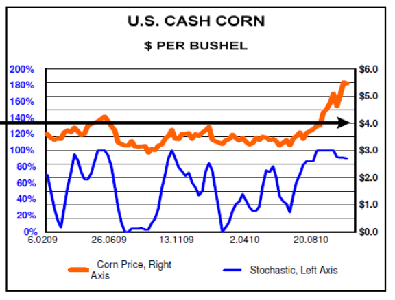 An integral part of the above dynamics is the price of corn, portrayed in the chart below. Corn is now operating in the price inelastic portion of the long-run supply curve. That implies two things. First, US$4 is the new floor for corn prices. Second, small increase in demand results in greater percentage increase in prices. As no new corn will be produced in North America till September 2011, price of corn can move far more than many expect. Given this situation, a forecast of $7 corn in late 2011 is neither bold nor unrealistic.
