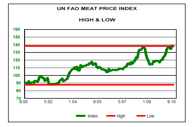 In the above chart is plotted the UN FAO's meat price index, which recently rose to a new high. That new high, though, relates not to today's higher grain prices, but to the higher grain prices of two years ago. When grain prices rise, rather than absorb the higher costs, animal feeders move to reduce their animal count. They sell them, rather than feed them. That selling pushes down meat prices temporarily. For that reason, meat prices in 2008 did not spike upward to the same extent as did grain prices.