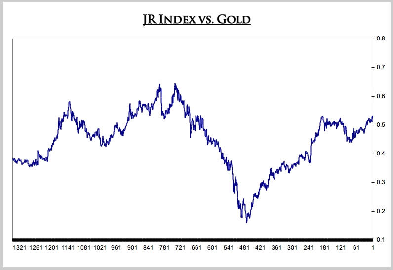 In regards to the juniors, our 25-stock index has performed quite well both nominally and in real terms. Next are two charts that show the performance in real terms.