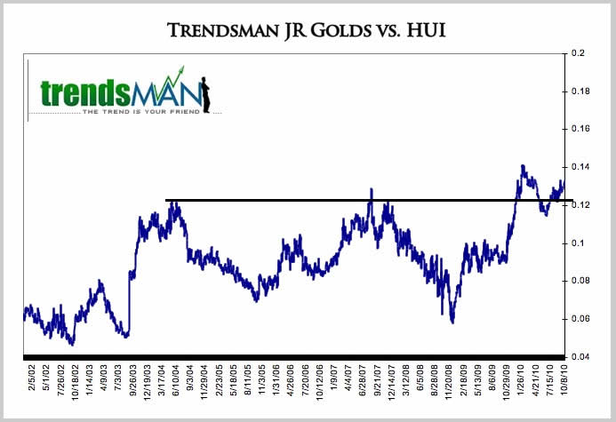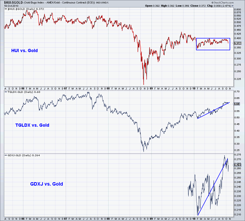 I am not sure which juniors Peter Schiff is referring to but the juniors we follow have performed very well. It is clear that the juniors are the place to be if you want growth and leverage. The juniors, when measured against Gold have recovered significantly, while the HUI (GDX) has only recovered less than half of its losses against Gold. Also we can see the when measured against the HUI, the juniors have made a major breakout.