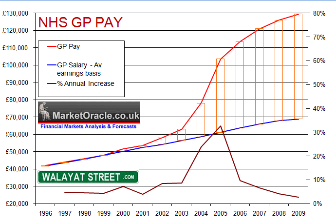 Whilst spending on the NHS has doubled in real terms (after inflation), the NHS has consistently failed to deliver, where an estimated 70p in every extra £1 spent on the NHS has disappears down a black hole. An example of where the money has disappeared is illustrated by GP Pay, which during Labours early years GP pay had been tracking quite closely with that of average earnings, until the 2002-2003 GP contracts which sent annual pay rises soaring into the stratosphere, culminating in pay rises of more than 30% per annum which effectively means that GP's are now paid nearly twice that of where there pay should be in terms of average earnings.