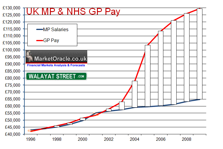 The Explosion in GP Pay contributed towards the MP Expenses scandal as when Labour came to power in 1997 average MP pay was £43,722 against average NHS GP pay of £44,000, so both were inline with one another at that time. However as the below graph illustrates in 2003 GP and MP pay started to see a serious divergence which ignited jealousy amongst MP's that directly led to the adoption of the policy of claiming expenses to the maximum so as to fill the ever widening gap between MP's and NHS GP's, as MP's could NOT get away with awarding themselves pay hikes of 30% per annum without voter out cry and risked losing their seats at the following general election, therefore across the board systematic abuse of expenses started to take place which basically meant real average MP pay was approx £98,000 per annum, still considerably less than where GP pay had risen to.