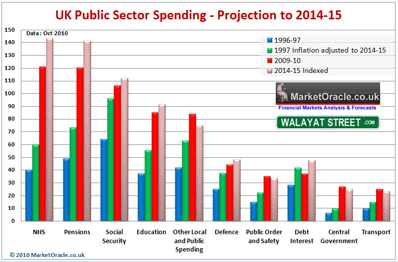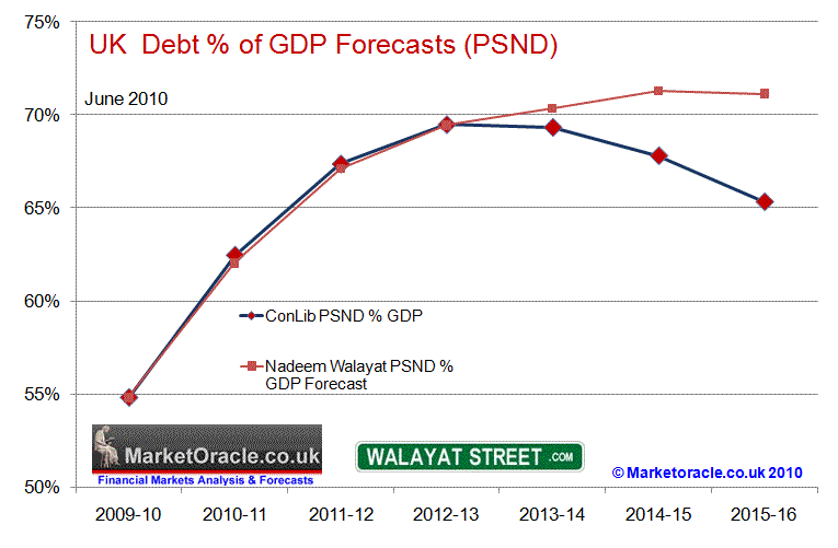 Therefore the only real mechanism for effecting cuts in non ring fenced spending departments will continue to be by means of Inflation as warned of in the Inflation Mega-Trend ebook (FREE DOWNLOAD) and more recently (29 Jun 2010 - UK ConLib Government to Use INFLATION Stealth Tax to Erode Value of Public Debt ). However the lack of cuts in the biggest spending departments also means that total debt burden in real terms as a percentage of GDP will not shrink as the public is being led to believe but actually continue to grow and at best suggests stabilisation at 72% of GDP by 2015-16, which is against government expectations for public debt to fall to 65% of GDP.