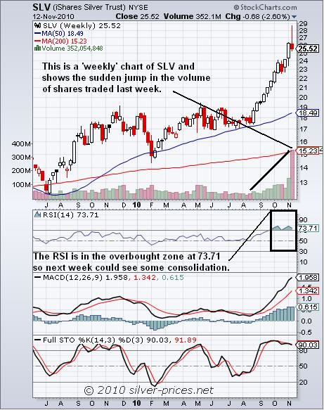 We kick off with a quick look at the ‘weekly’ chart of iShares Silver Trust (SLV) which shows the sudden jump in the volume of shares traded last week largely attributable to the surprise changes to the rules governing the use of margin, which were introduced with immediate effect, causing investors to scramble to meet higher margin requirements.