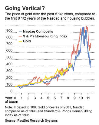 It compares the rise in gold today with the rise of the Nasdaq in the 1990s and the Dow Jones index of home-building stocks in the 10 years leading up to 2005-06.
