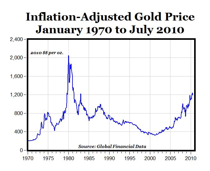Adjusted for inflation, the price of gold today is 41.5% below the January 1980 peak of more than $2,000 per ounce (in 2010 dollars).