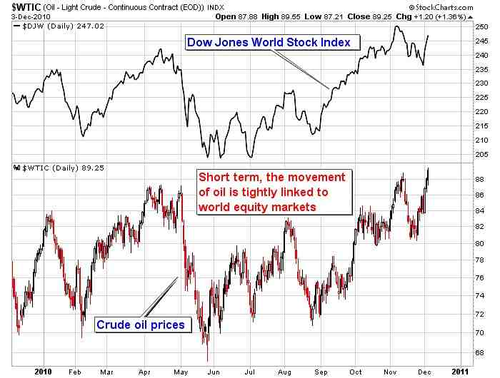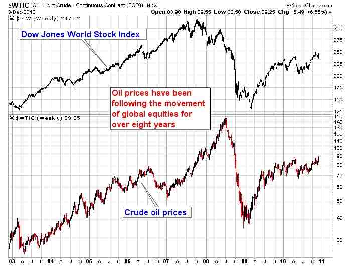 Over the past eight years, the price of the world's heaviest traded commodity has been linked to the course of global equities (Chart 1). Since the beginning of the last bull market (2003) the Broad-based Dow Jones World Stock Index (DJWSI) has generally lead the price of oil through its many turns. The bond between these two different asset classes is the economy. Shorter term, both asset groups held a particularly tight correlation in 2010 (Chart 2) with global stock market movements leading the path of oil.