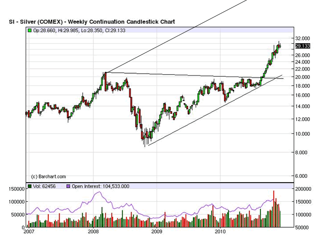 A move in silver is a lot of fun because it has great volatility to the upside, but this often happens with regard to commodities. Special situations develop, and there is simply not enough supply to meet demand. A case in point was early November when silver peaked at $29. The silver bulls had been making money through the autumn, and they kept plowing this money back into the market. The more money they made the more they plowed back, and the cycle built on itself.