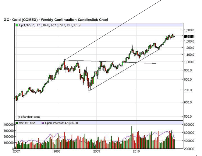 For example, a pennant formed in silver in November with a price objective of $40 (probably by mid-February). This is one number, simple and easy to play. However, the price objective line for the ascending triangle in silver on p. 1 is continuously rising. It is about $60 right now. It will be at $100 in January 2012, and by Sept. 2012 it will be at $150. This does not mean that silver absolutely has to get to one of these points. But it does have to get up to the line at some time. Clearly, the nearer points on the line will be exceeded, but the further points will never be attained.