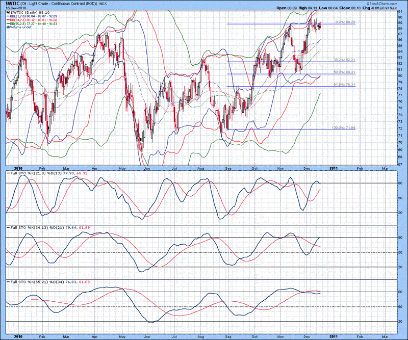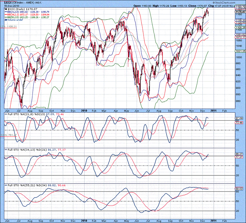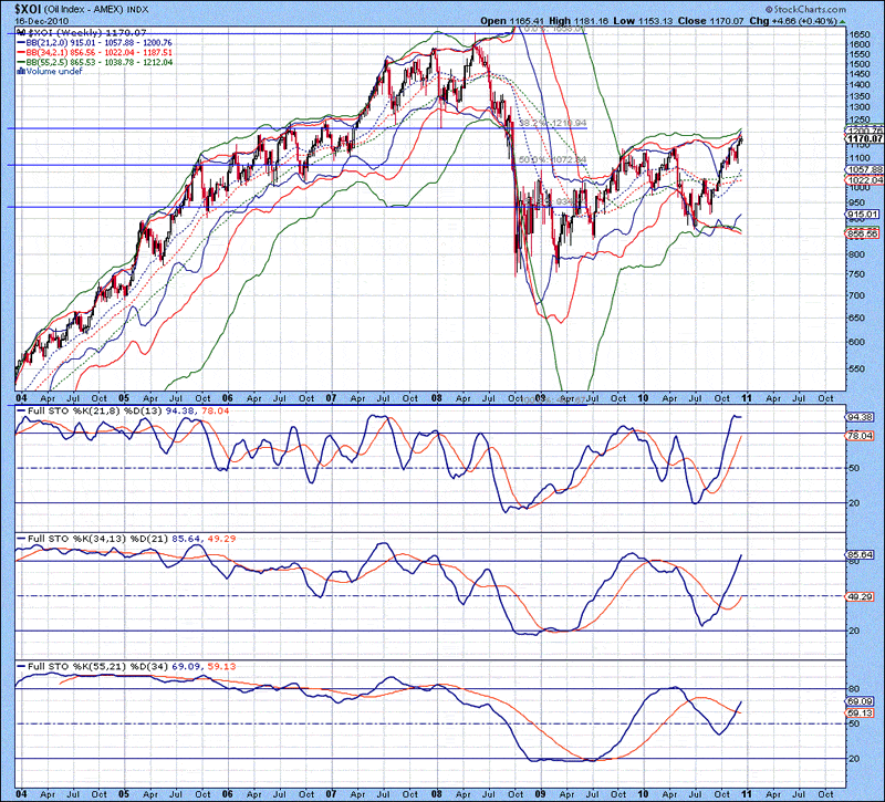 The weekly chart of the XOI is shown below, with upper Bollinger bands in close proximity to the index, suggestive that further upside potential exists. All three lower Bollinger bands are in close proximity to each other, with the lower 34 and 55 MA Bollinger bands declining, suggestive that further upside potential exists. When they both curl up, a top will likely have been put in place...this event is not likely to happen for at least 4-6 months, possibly even late 2011.