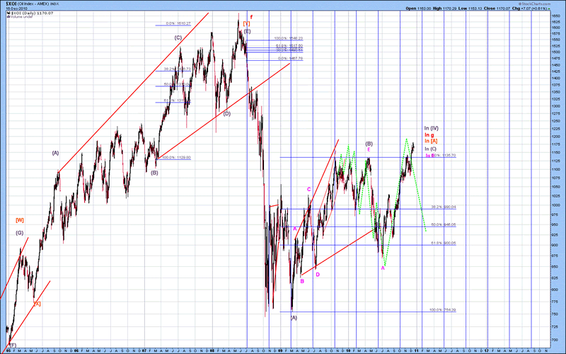 The long-term Elliott Wave count of the XOI is shown below, with the thought pattern shown in green...this pattern was added over one year ago and followed the trend very well. I am going to update this pattern in a few weeks...I am still playing around with a few different counts and trying to determine which one has the best potential. Based upon what the above charts are stating, the next 12 months are most likely to maintain an upward trend, with minor corrections along the way.