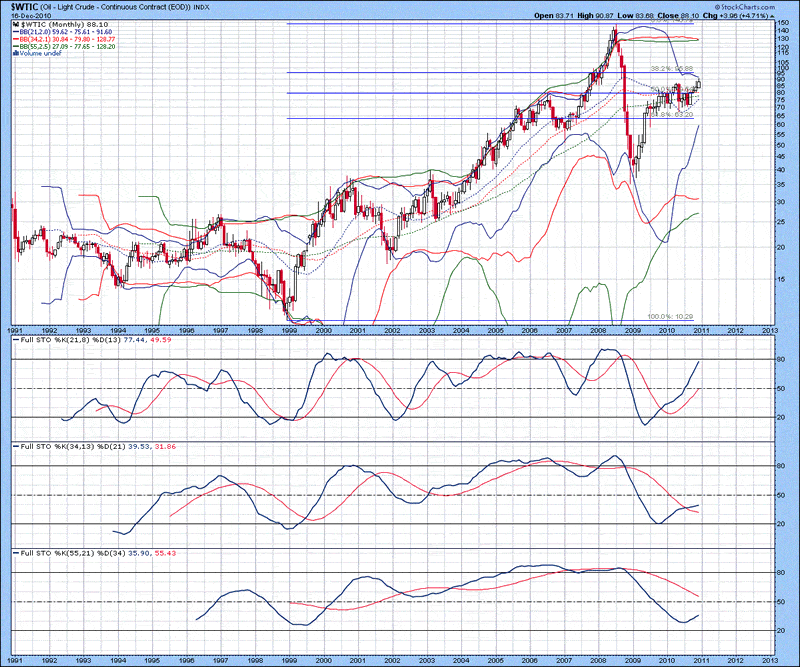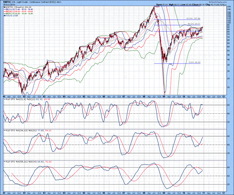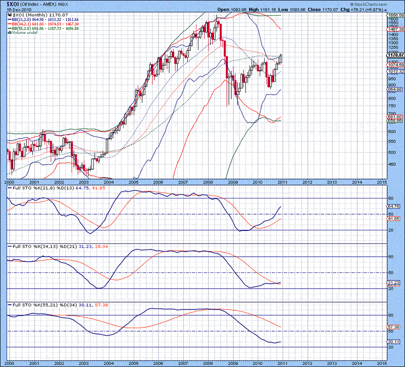 The monthly chart of the XOI is shown below, with lower 34 and 55 MA Bollinger bands beneath the index. There is no definitive pattern to suggest that a decline phase is set to start anytime soon...it anything, the chart suggests a top is not likely to be put in place for at least another 10-12 months. Full stochastics 1, 2 and 3 are shown below in order of descent, with the %K above the %D in 1 and 2 and beneath the %D in 3. Extrapolation of the trend suggests at least 10-12 months of sideways to upward price action before topping out. Overall, the price of oil should be stable over the course of 2011.