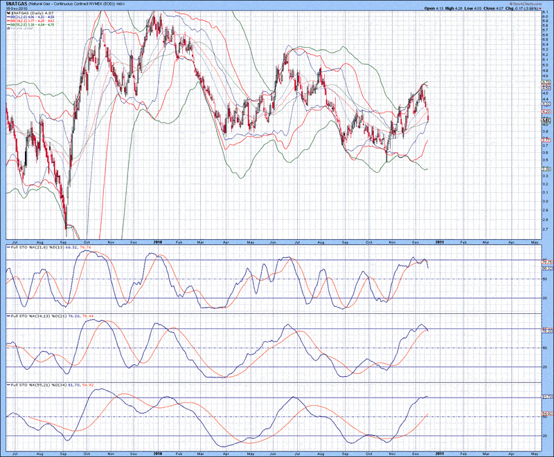 The daily chart of natural gas is shown below, with upper Bollinger bands well above the index, suggestive that a top was put in place. The lower 55 MA Bollinger band recently curled up, further confirming the top. The lower 21 MA Bollinger bands recently touched the index, suggestive that further downside lies ahead. Full stochastics 1, 2 and 3 are shown below in order of descent, with the %K beneath the %D in 1 and 2 and above the %D in 3.Extrapolation of the %K in stochastics 1 and 2 suggest 3-4 weeks of further downside before a bottom is put in place.