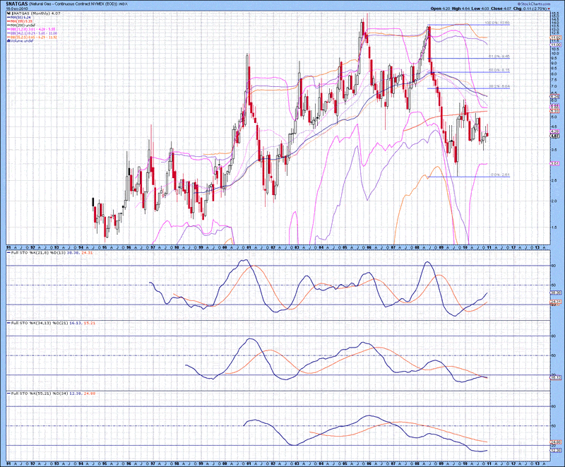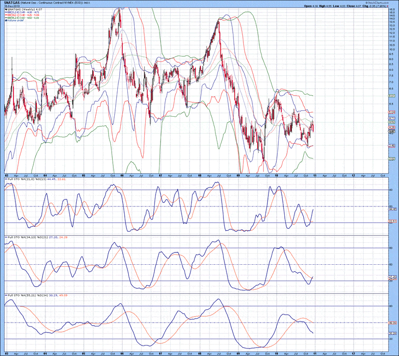 The monthly chart of natural gas is shown below, with upper and lower 34 and 55 MA Bollinger bands well beneath the index, suggestive that the corrective phase from the 2008 top is not yet complete. Full stochastics 1, 2 and 3 are shown below in order of descent, with the %K above the %D in 1 and 2 and beneath the %D in 3. Although the %K in stochastic 1 indicates an upward trend is in place, natural gas prices are likely to remain range bound over the course of the next 4-6 months.