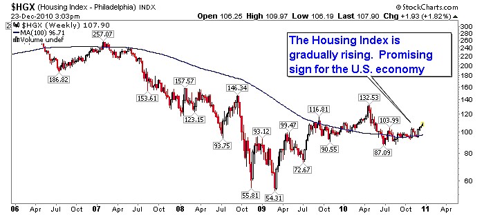 Bottom line: The S&P 500 has the underpinnings for additional upward movement into 2011. Q1 represents the theoretical mid-point of the 2009-2013 bull market. This suggests next year should provide higher numbers for the stock market. Fundamental and economic considerations are also on the rise. Corporate earnings and U.S. GDP are displaying a positive trend. The U.S. housing market, one of the worst affect sectors from the financial meltdown, is recovering.