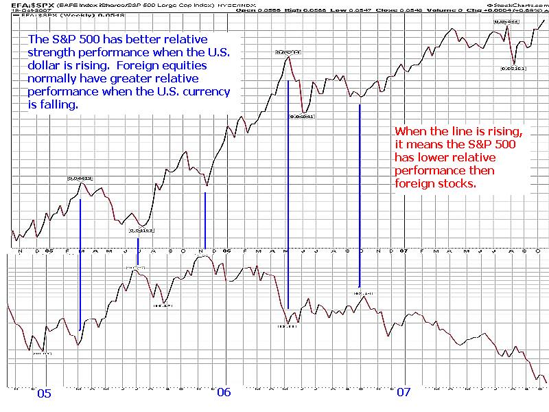 In the top portion of Chart 1, is the foreign stock index EAFE (symbol EFA) divided by the S&P 500. The lower portion of the chart is the U.S. dollar index. When the line in the top portion of the chart rises, it indicates that the EAFE index has greater performance than the S&P 500. Alternatively, when the line falls, as in the 2nd quarter of 2005, the S&P 500 has higher relative performance. The evidence indicates that when the U.S. dollar increases in value, there is higher performance from the S&P 500. However, as the currency has been declining over the past four years, the EAFE has increased and out performed the S&P 500.