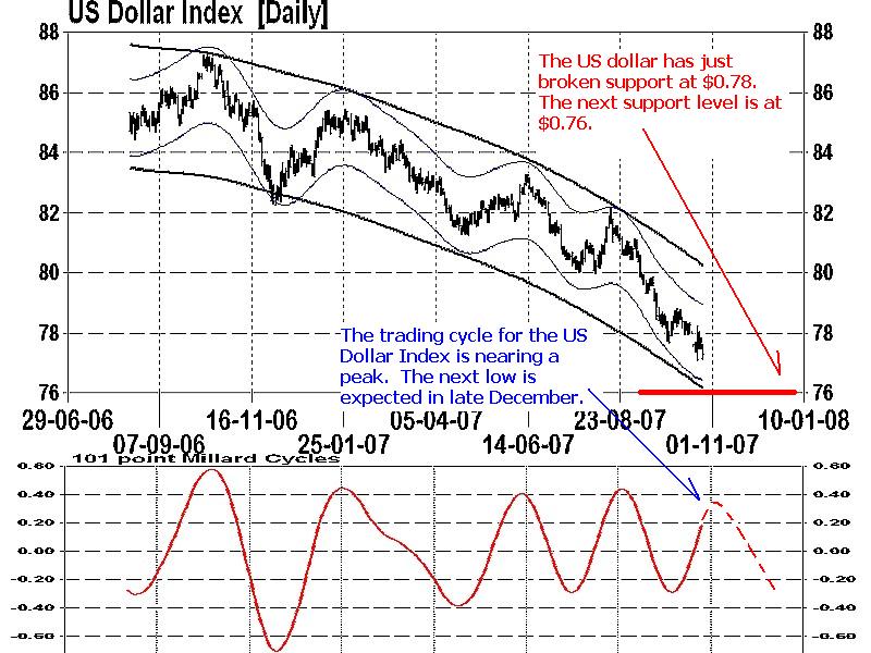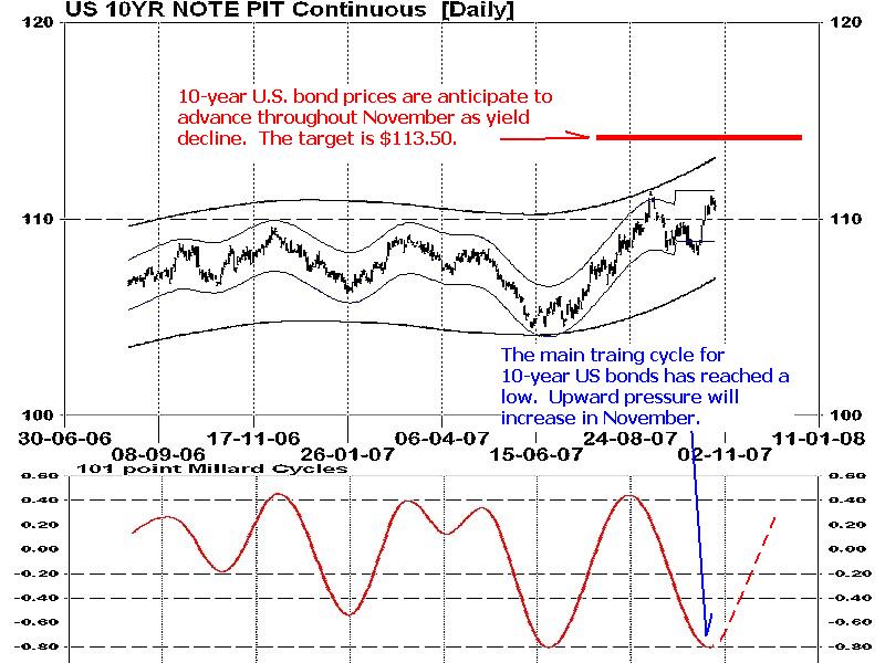 The movement in bonds is often a forecast of the direction of the Fed. A hawkish approach by the FOMC often sees bond prices retreat just before important meetings. Conversely, the expectations of lower rates will bond prices firm. In chart 2 of the 10-year U.S. Treasury bonds, technical evidence indicates growing strength throughout September and October as bond prices stabilize above $108.50. In the lower portion of the chart, the 8-week trading cycle has reached a low in late October. Increasing upward pressure can be anticipated in November.