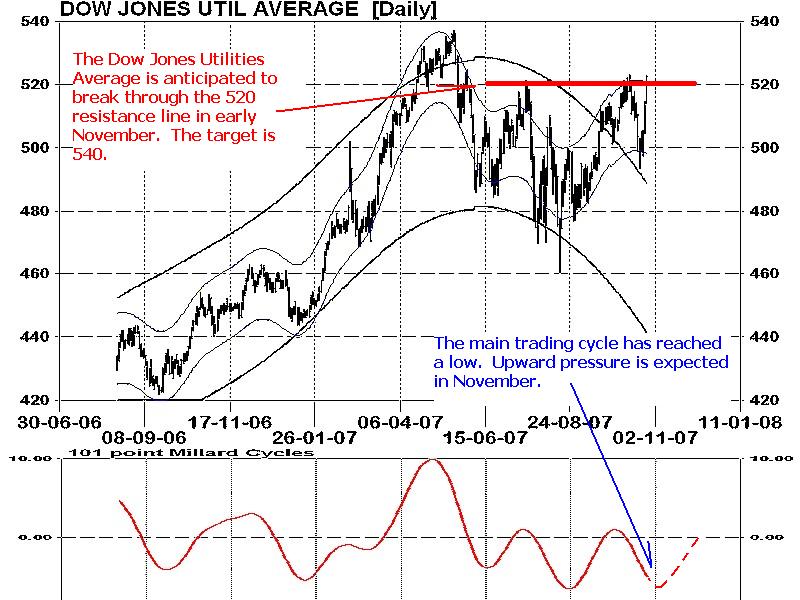 Utilities are the most interest rate sensitive equity sector. Due to their fixed income leverage, this group of stocks often moves with anticipation of rate adjustments. In chart 3 of the Dow Jones Utilities Average, recent market action has pushed this sector back up toward the resistance level of 520 again. New buying pressure and technical evidence in late October supports expectations of additional advancement. Projections place the first target at 540.